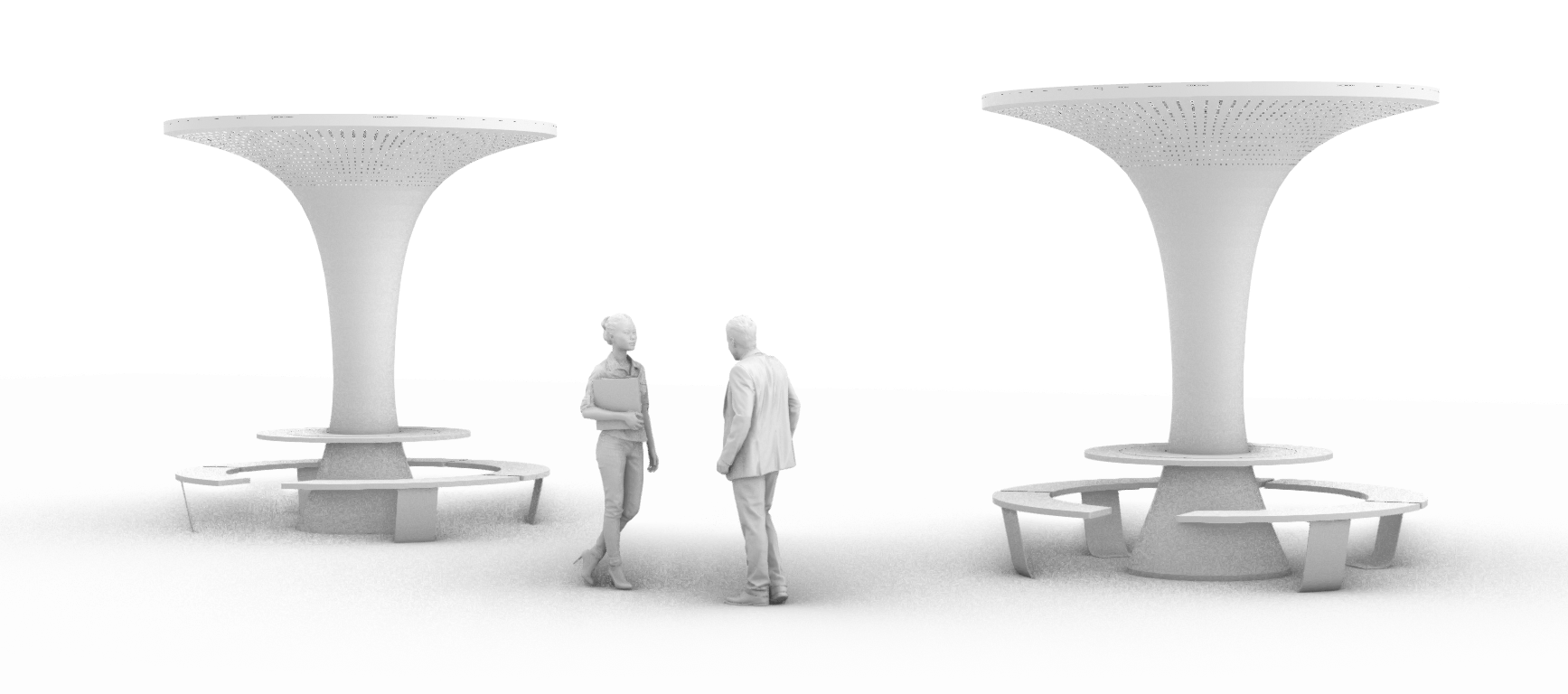 The base of the structure includes a system of concentric circular benches, segmented to allow circulation and access. The components are arranged to form a continuous yet open configuration, with the central column acting as the main structural support.